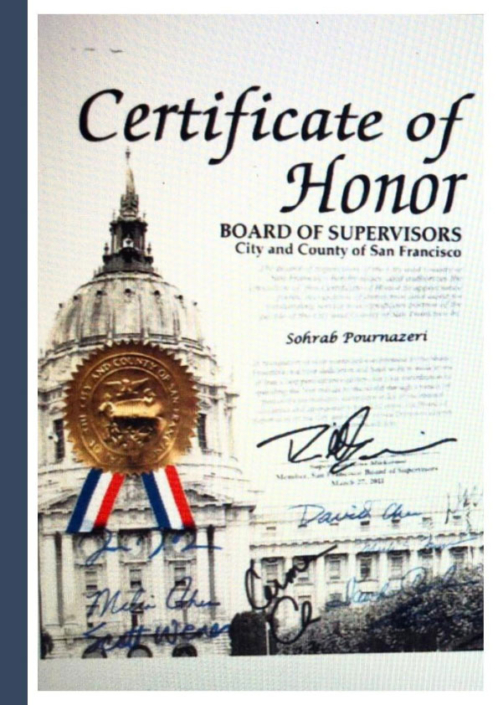 The Certificate of Honor from the Board of Supervisors of the City and County of San Francisco. (In recognition of your continued commitment to the Shams Ensemble; for your dedication and hard work to make it one of Iran’s best performance groups; for your contribution to spreading Iran culture to the world through a variety of percussive instruments, distinctive styles of the musical dynamics and arrangements for all to enjoy…)